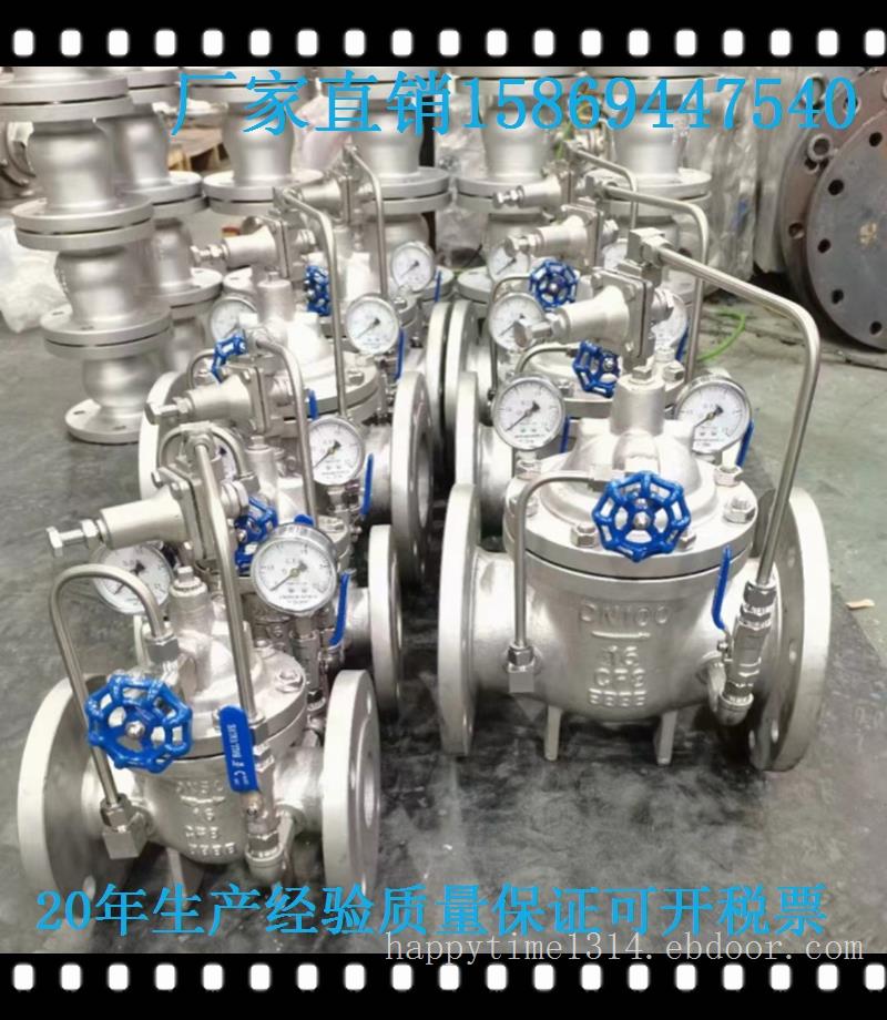 200X减压阀是一种用于消防用水与生活用水并联的供水系统中,用来调配供水方向的阀门。当火灾发生时,消防急需大量用水,立即切断生活用水,确保足够的消防用水;当消防停止用水压力减小时,阀门自动打开,呈常开状态,恢复生活供水。该阀使系统无须另设专门的消防单独供水管网,大大地节约了建设成本和用水量。阀门控制灵敏度高,安全可靠,调试简便,使用寿命长。 设备组成水利控制阀就是水压控制的阀门,水力控制阀由一个主阀及其附设的导管﹑导阀﹑针阀﹑球阀和压力表等组成。根据使用目的﹑功能及场所的不同可演变成遥控浮球阀﹑减压阀﹑缓闭止回阀﹑流量控制阀﹑泄压阀﹑水力电动控制阀、水泵控制阀等。安装要求200X减压阀前要安装过滤器,并应便于排污的要求。水利控制阀是一种利用水自润式阀体,无须另加机油润滑,如遇主阀内零部件损坏时,请按下列指示进行拆卸。(注:内阀内一般消耗损伤品为膜片和 ...但在工程中应用水力控制阀时,还存在一定误区,如阀的适用条件,阀的设计选用要求,安装要点等,为此,本文拟以 CECS 标准《水力控制阀应用设计规程》为基础,结合本人的体会来阐述上述诸方面的问题。 2水利控制阀阀设计选用要点( 1 )工程式中应用的水力控制阀是经过制造厂检验合格,各种标识齐全,技术资料符合要求的产品。( 2 )根据功能要求,选择阀门种类,再根据管道输送介质、温度、建筑标准和业主 要要求 等,确定阀门的阀体和密封部位的材质。常用的阀 体材料有铸铁 、铜铁、铜、塑料等。常用的密封面和衬里材料有铜合金、塑料、钢、硬质合金、橡胶等。阀 体材料应与管道材料相匹配。( 3 )阀门的公称压力有0.6、1.0、1.6、2.5和4.0MPa等不同级别,管道输送的介质,其工作压力应小于阀门的公称压力值。( 4 )工程中水力控制阀的设置应当有足够的空间,以便管理、操作、安装和维修,并应符合管路对阀门的要求。( 5 )管路采用法兰连接时,应采用法兰连接的水力控制阀;管路采用沟槽式连接时,应采用沟槽式连接的水力控制阀。( 6 )水利控制阀应设置在介质单向流动的管路上。( 7 )水利控制阀主阀体上的箭头方向必须与管路系统流向一致。( 8 )接水力控制阀管段不 应有气堵 、气阻现象。在管网位置 等存气段 应设置自动排气阀。( 9 )阀门水平安装时,阀盖、阀杆应朝上。垂直安装时,阀盖、阀杆应朝外。( 10 )阀门安装前应做强度和严密性试验。( 11 )阀门的强度和严密性试验应符合以下规定。A、阀门的强度试验压力为公称压力的1.5倍;B、阀门的严密性试验压力为公称压力的1.5倍;C、试验压力在试验持续时间内应保持不变,且壳体填料及阀瓣密封面无渗漏;D、阀门试验持续时间按上表。 3结构特点和用途200X减压稳压阀由主阀、导阀、针阀、球阀、微型过滤器和压力表组成水力控制接管系统。使用时,当调定出口压力后,能自动保持稳定出口压力。本产品利用导阀自力控制,不需要其它装置和能源,保养简便,压力控制准确度高,受进口压力和流量影响小,减压稳压可靠。本系列阀门产品广泛用于高层建筑、生活区等供水管网系统及城市供水工程。 4工作原理当阀门从进口端给水时,水流过针阀进入主阀控制室,出口压力通过导管作用到导阀上。当出口压力高于导阀弹簧设定值时,导阀关闭。控制室停止排水,此时主阀控制室内压力升高并关闭主阀,出口压力不再升高。当阀门出口压力降到导阀弹簧设定压力时,导阀开启,控制室向下游排水。由于导阀系统排水量大于针阀的进水量,主阀控制室压力下降。进口压力使主阀开启。在稳定状态下,控制室进水、排水相同,主阀开度不变,出口压力稳定。调节导阀弹簧即可设定出口压力。 5主要技术参数公称压(Mpa) 壳体试验压力(MPa) 密封试验压力(MPa) 进口压力(MPa) 出口可调压力(MPa) 适用介质 介质温度(℃) 1.0 1.5 1.1 1.0 0.09-0.8 水 6主要零件材料零件名称 零件材料 阀体 阀盖 CF8,CF8M,WCB,HT250,QT450 阀座 阀盘 F304,F316,,铜合金 密封圈 O型圈 PTFE,丁腈橡胶 阀杆 F304,F316,2Cr13 弹簧 50CrVA 针型阀 不锈钢,铜合金 球阀 不锈钢,铜合金 浮球阀 不锈钢,铜合金 微型过滤器 不锈钢 部件列表:1、导阀2、主阀3、球阀4、压力表5、针表 7连接尺寸DN L A A1 H H1 F Dmm D1mm D2mm n-Φd         mm mm mm mm mm mm PN1.0 PN1.6 PN2.5 PN1.0 PN1.6 PN2.5 PN1.0 PN1.6 PN2.5 PN1.0 PN1.6 PN2.5  20 180 292 136 342 247 116 105 105 105 75 75 75 58 58 56 4-13.5 4-13.5 4-14 25 180 292 136 342 247 116 115 115 115 85 85 85 68 68 65 4-13.5 4-13.5 4-14 32 180 292 136 342 247 116 140 140 140 100 100 100 78 78 76 4-17.5 4-17.5 4-18 40 240 330 155 395 278 170 150 150 150 110 110 110 88 88 84 4-17.5 4-17.5 4-18 50 240 330 155 395 278 170 165 165 165 125 125 125 102 102 99 4-17.5 4-17.5 4-18 65 250 350 165 405 298 180 185 185 185 145 145 145 122 122 118 4-17.5 4-17.5 8-18 80 285 365 175 430 313 210 200 200 200 160 160 160 133 133 132 8-17.5 8-17.5 8-18 100 360 410 195 510 350 275 220 220 235 180 180 190 158 158 156 8-17.5 8-17.5 8-22 125 400 455 220 560 365 310 250 250 270 210 210 220 184 184 184 8-17.5 8-17.5 8-26 150 455 475 230 585 420 355 285 285 300 240 240 250 212 212 211 8-22 8-22 8-26 200 585 530 255 675 450 460 340 340 360 295 295 310 268 268 274 8-22 12-22 12-26 250 650 623 300 730 470 500 395 405 425 350 355 370 320 320 330 12-22 12-26 12-30 300 800 700 340 760 490 580 445 460 485 400 410 430 370 370 389 12-22 12-26 16-30 350 860 840 415 840 526 640 505 520 555 460 470 490 430 430 448 16-22 16-26 16-33 400 960 